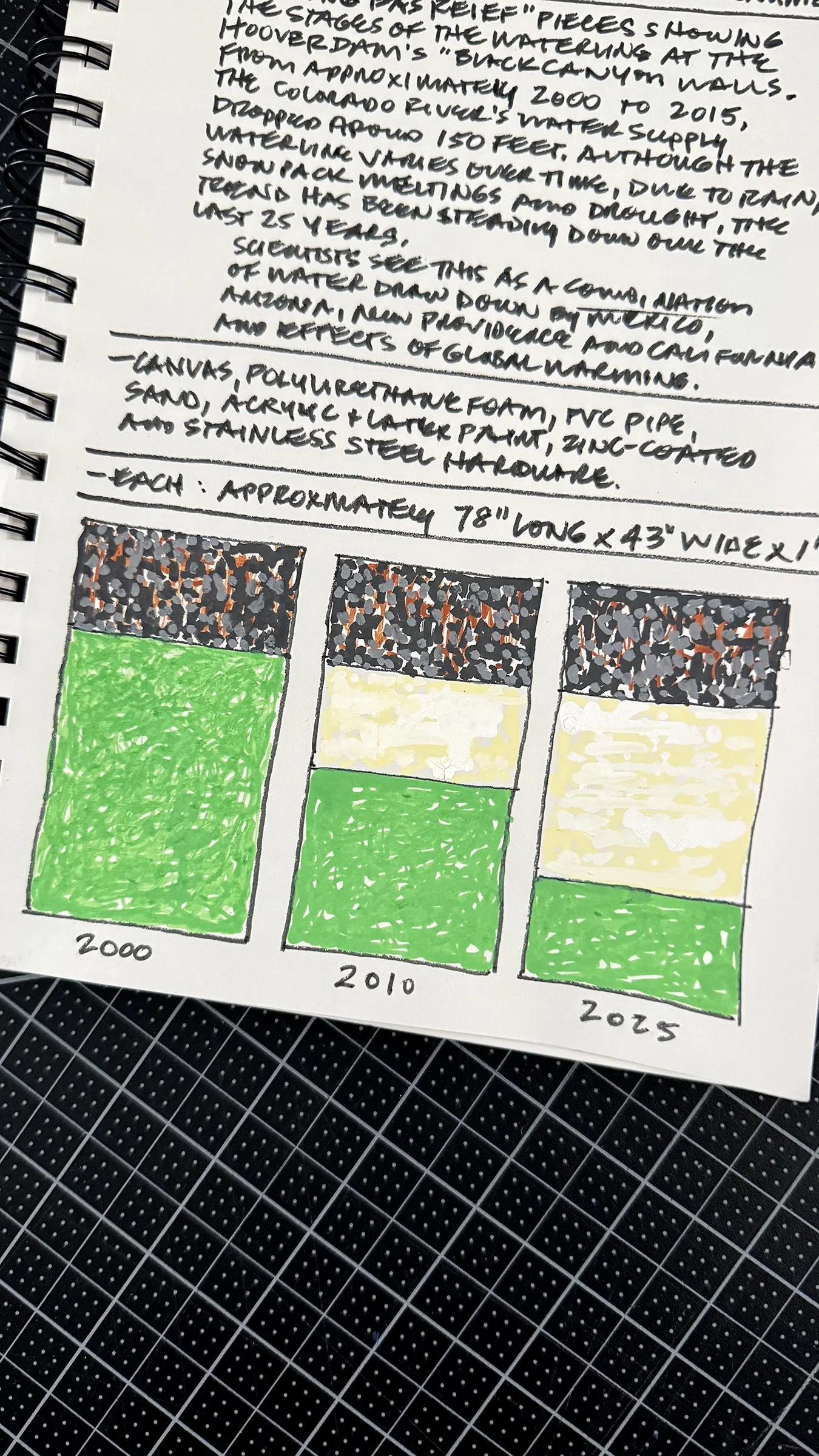 This decades-long drop in water levels was not only from increased massive water use in the Southwest USA but was also described by scientists as an effect of global warming. After creating some small paintings I decided to work at a larger scale to better express what I saw. The three-sculpture piece I am submitting here, “Waterline” is the result of taking this concept to another level.
