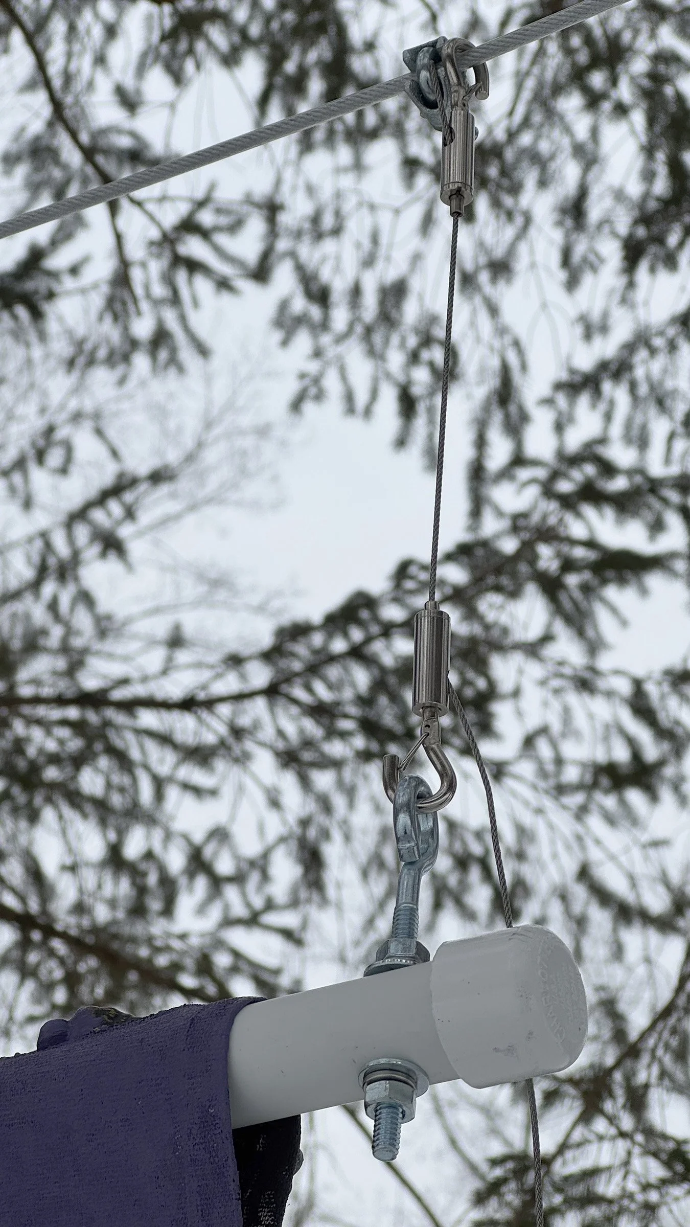 PVC bars were hung with coated steel wire safely wrapped around two tree trunks and with stainless steel hanging wires and clips.